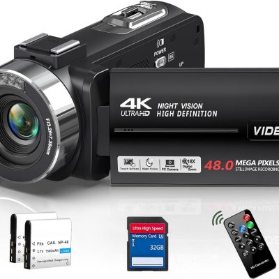 Video Camera Camcorder 4K 48MP 30FPS with IR Night Vision,18X Digital Zoom Camera Recorder 3.0″ LCD Touch Screen Vlogging Camera for YouTube with Controller, 32GB SD Card, 2 Batteries