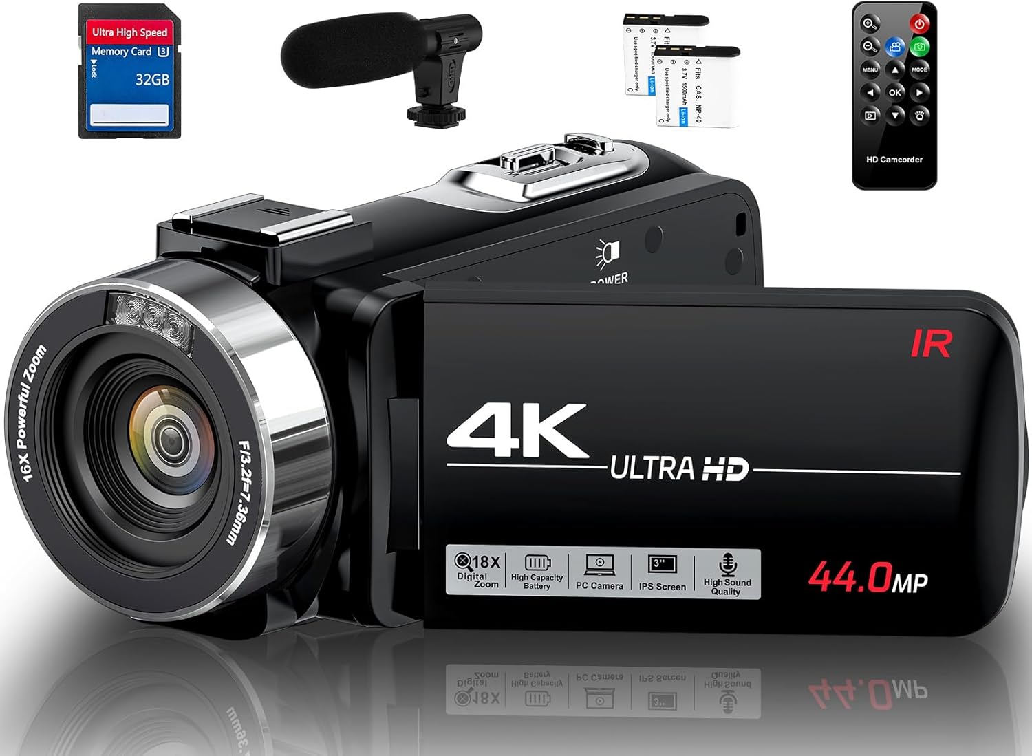 Camcorder Video Camera 4K Ultra 44MP Vlogging Camera for YouTube 18X Digital Zoom Camcorder 3.0″ IPS Screen Video Recorder with External Mic, Controller, 2 Batteries and 32G SD Card