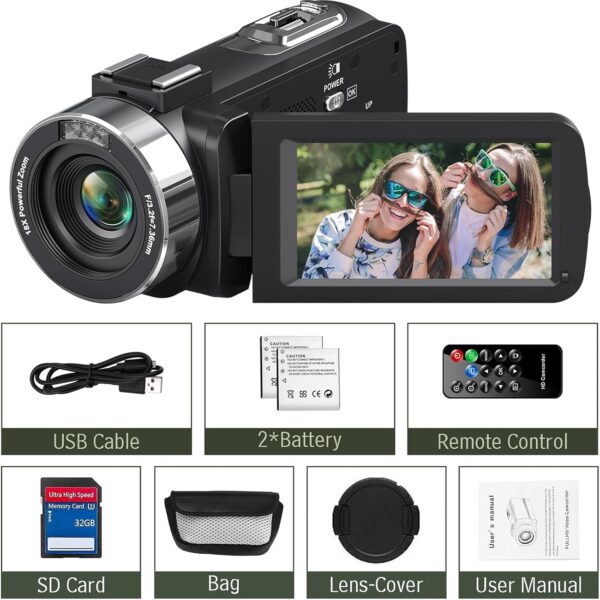 Included with the camcorder is a 32GB SD card for storing all of your footage, as well as two rechargeable batteries for extended shooting sessions. Whether you’re capturing family vacations, special events, or creating content for YouTube, this Video Camera Camcorder has everything you need to take your videos to the next level.